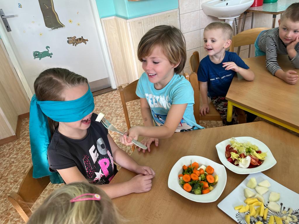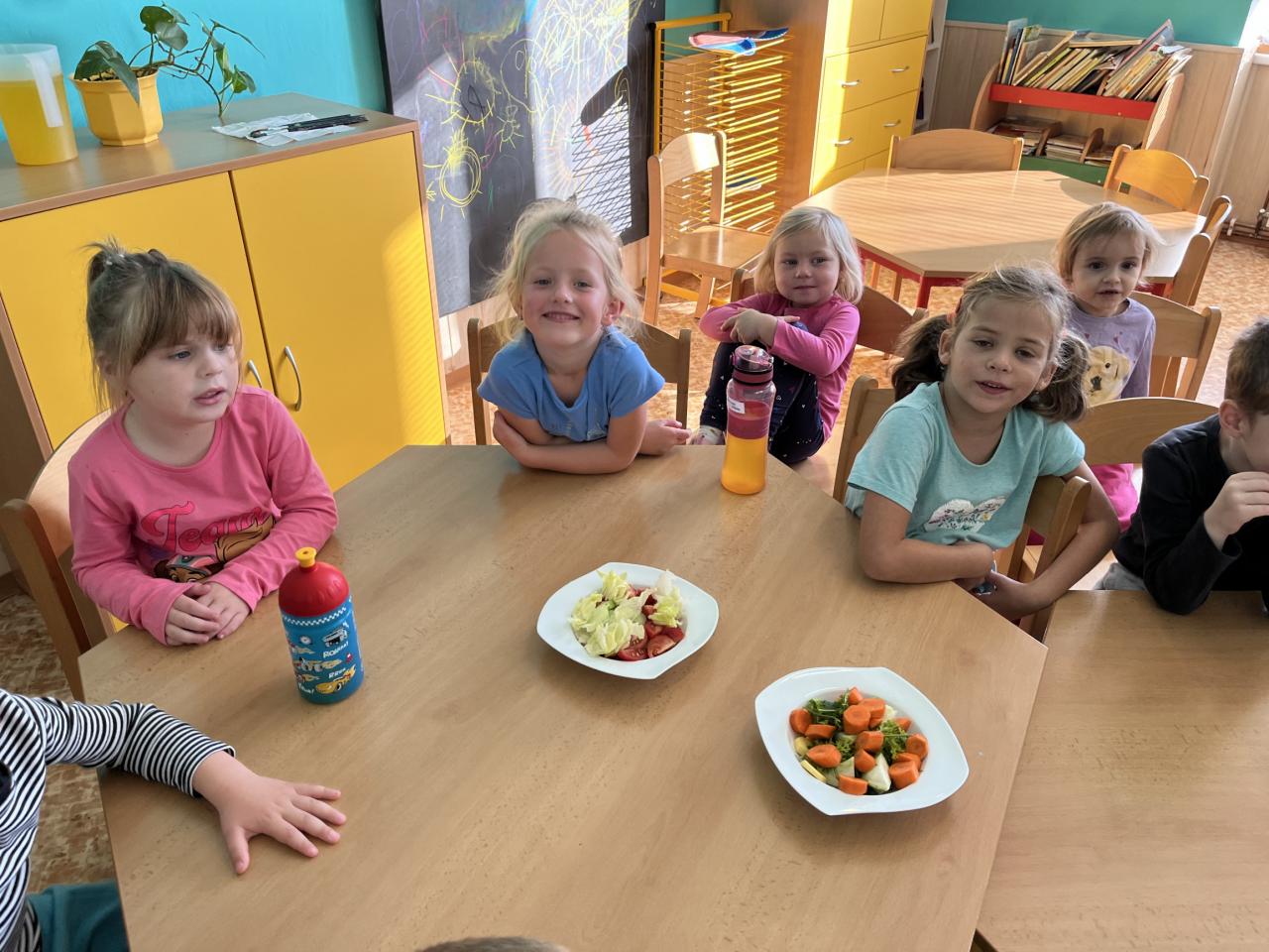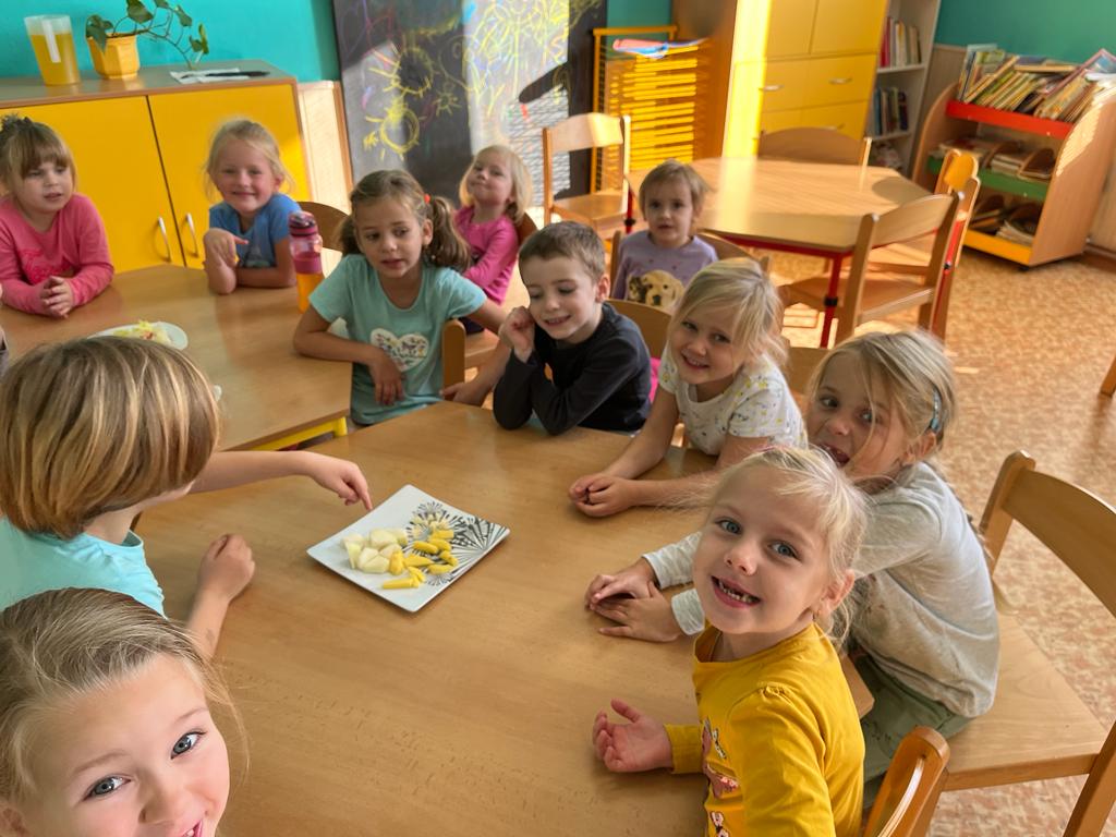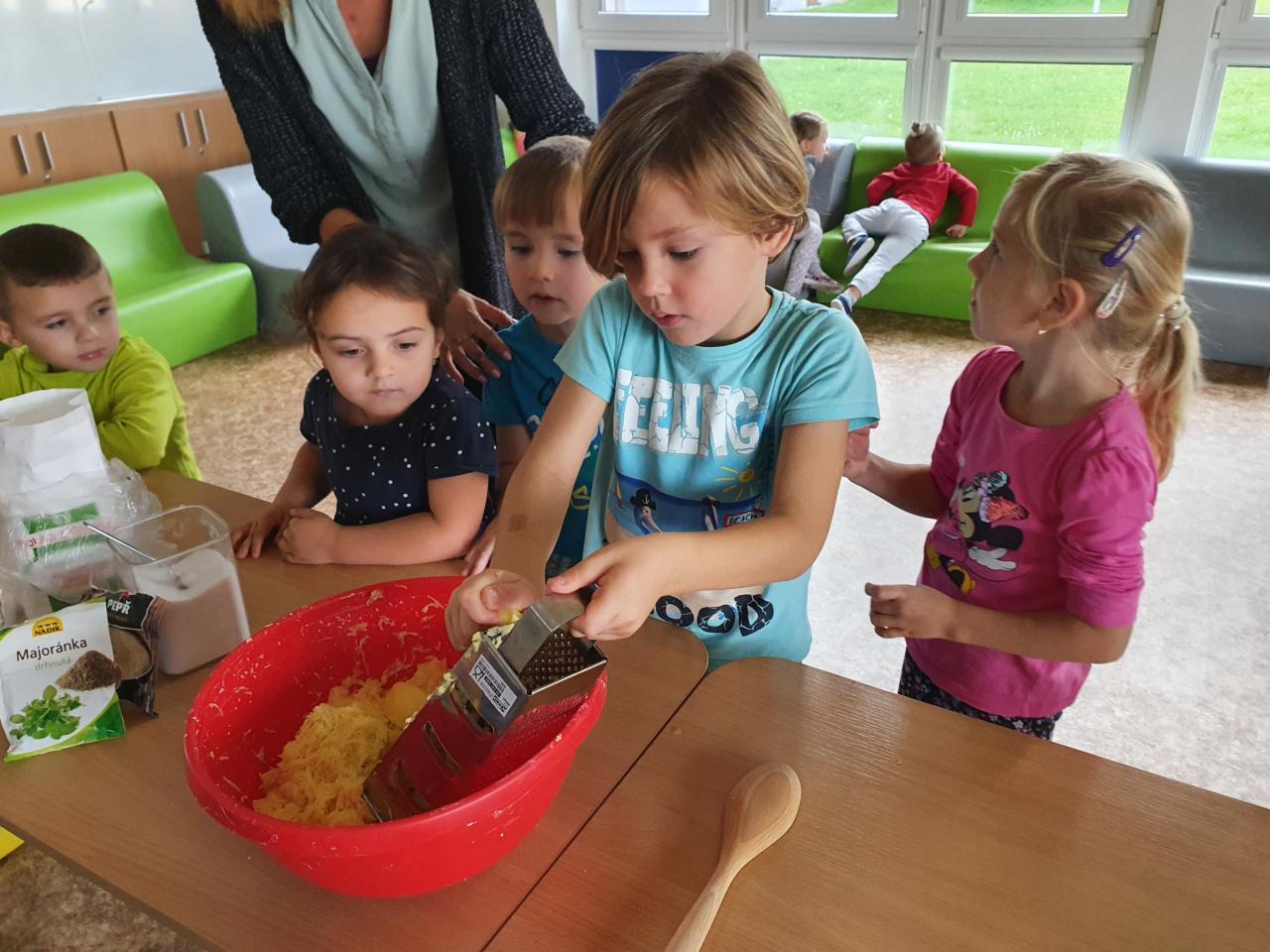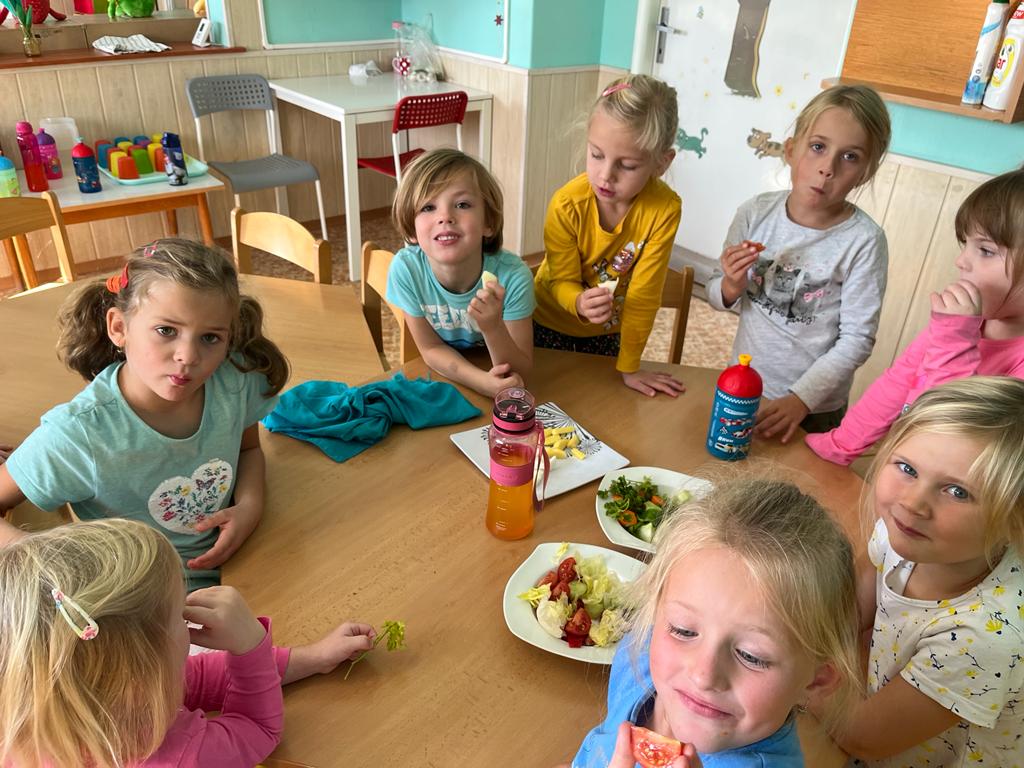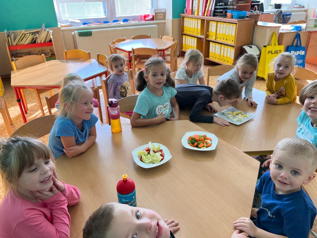 V tomto týdnu se děti dozvěděly, nebo si připoměly, které druhy zeleniny se pěstují v zahrádkách a které plodiny rostou na našich polích. Společně jsme si usmažili bramboráky. Zahráli jsme si pohádku O veliké řepě, ochutnávali a poznávali jsme zeleninu pomocí všech smyslů. Zpívali jsme a učili se básničky a děti vytvořily krásné papírové mrkvičky a brokolice.