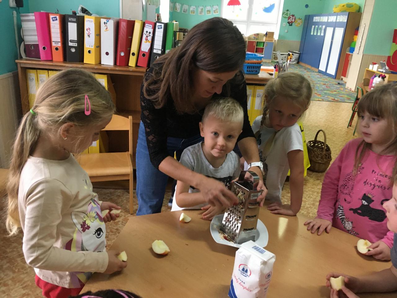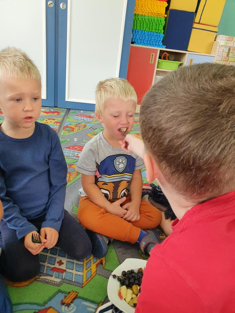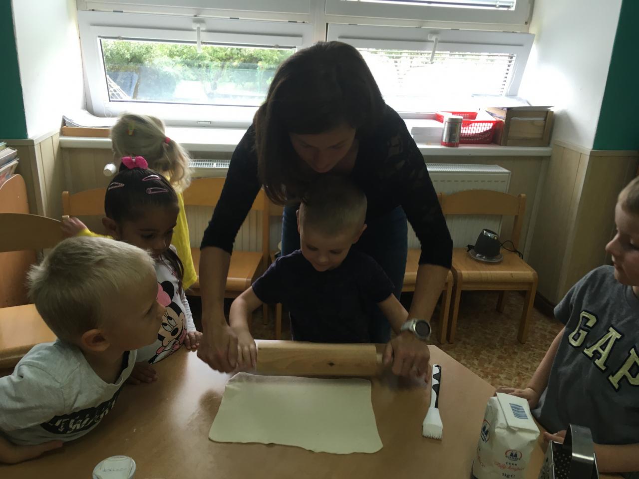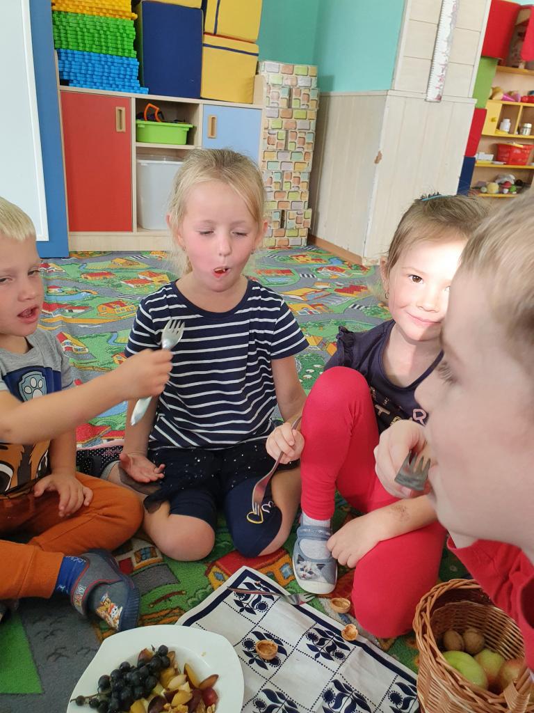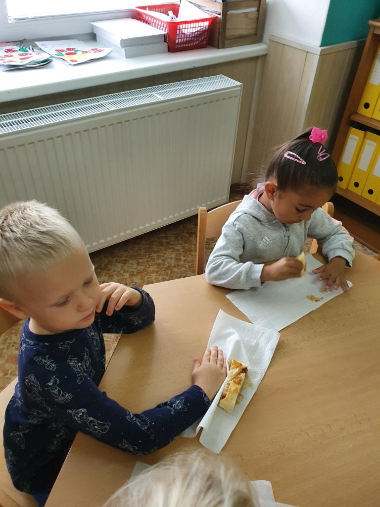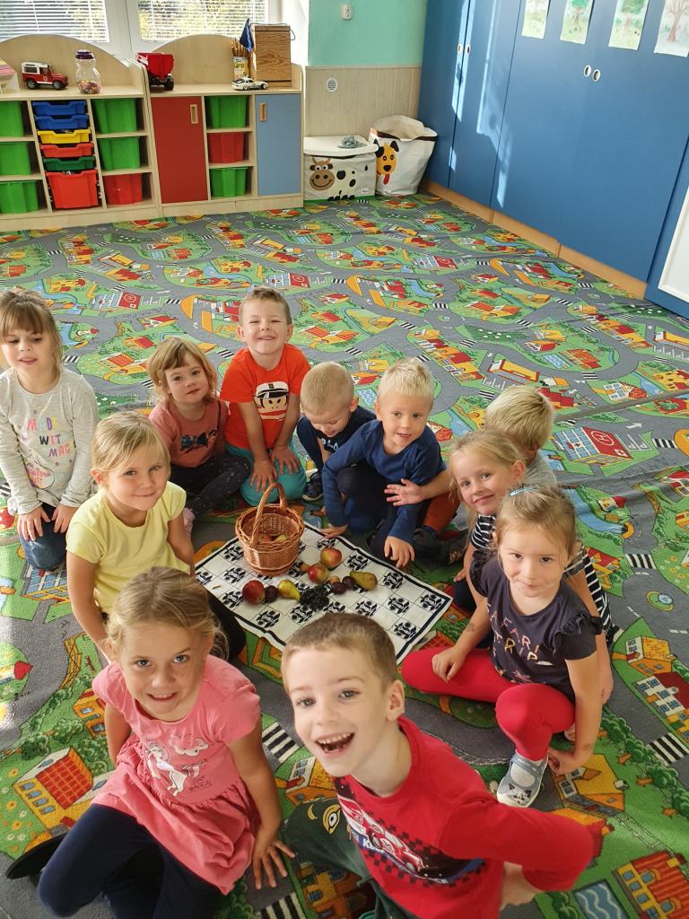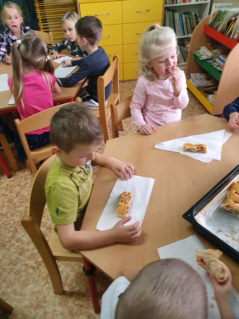 Jak už to tak bývá na podzim, venku se nám mění počasí, listí zlátne a plody na stromech dozrávají. Proto i my ve školce jsme si celý týden povídali, které ovoce dozrává na podzim a zažili s ovocem spoustu věcí – poznávali jsme ho pomocí smyslů – po hmatu, podle chuti, vůně a zrakem jsme určovali tvary a barvy. Upekli jsme si i jablečný závin, který nám všem moc chutnal.