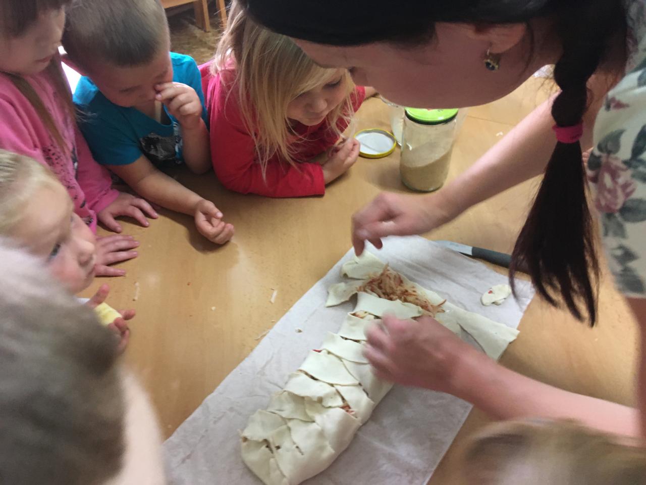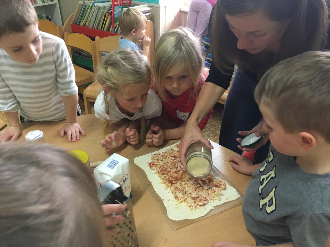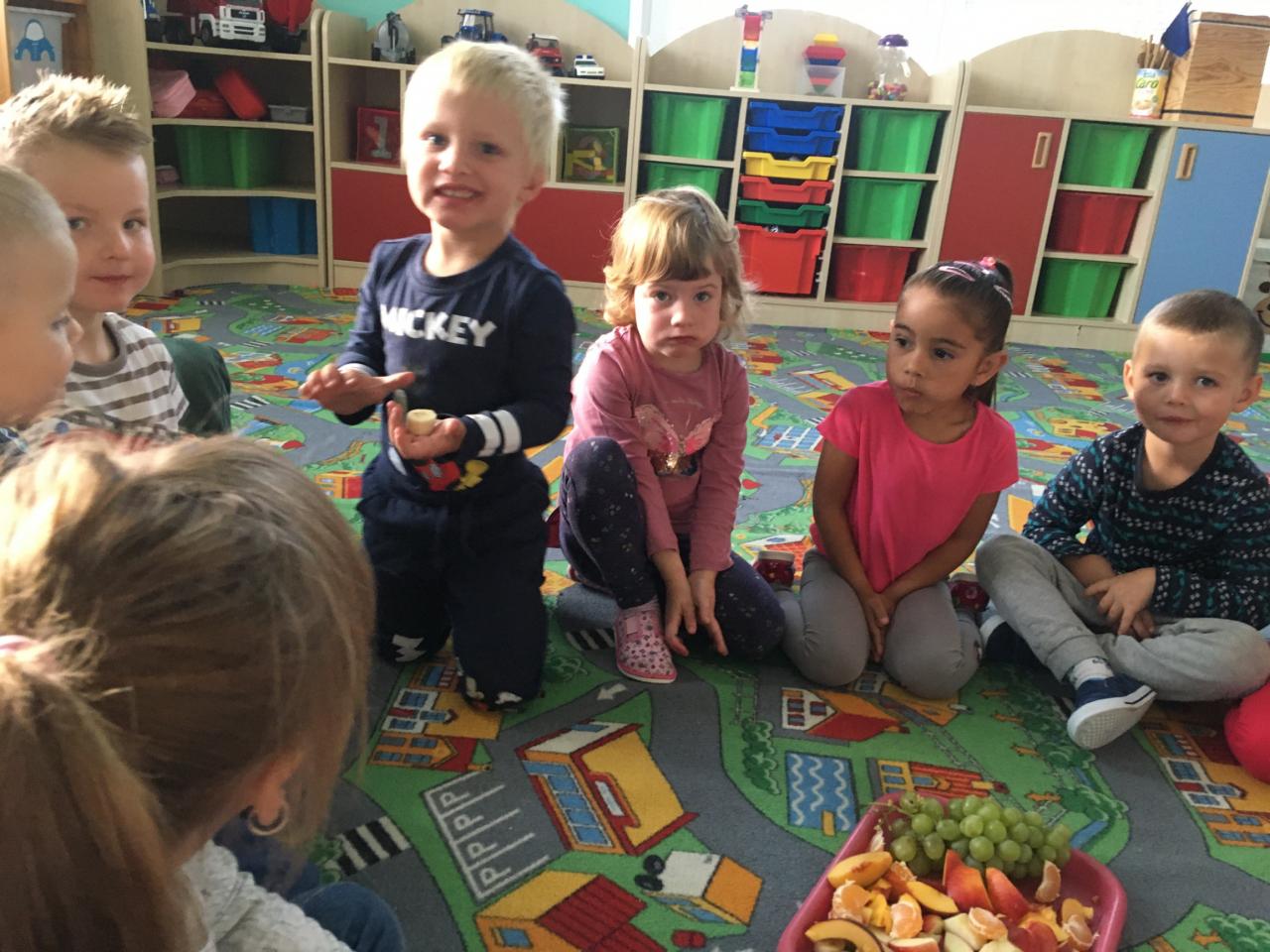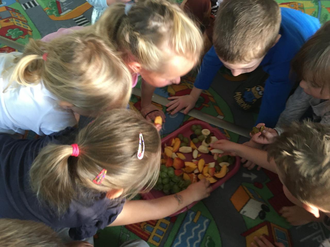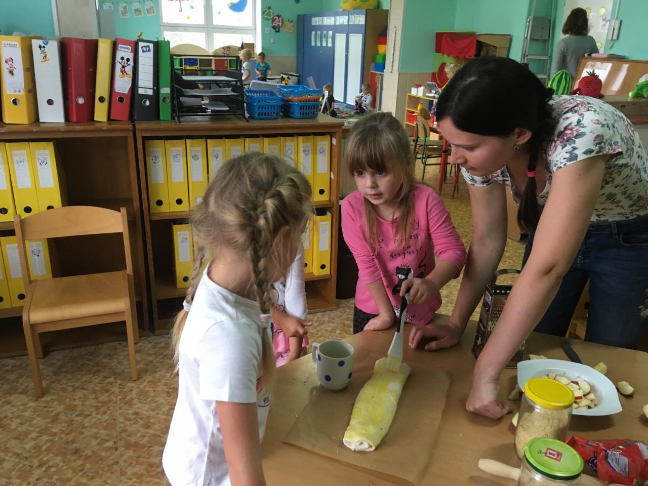 Jak už to tak bývá na podzim, venku se nám mění počasí, listí zlátne a plody na stromech dozrávají. Proto i my ve školce jsme si celý týden povídali, které ovoce dozrává na podzim a zažili s ovocem spoustu věcí – poznávali jsme ho pomocí smyslů – po hmatu, podle chuti, vůně a zrakem jsme určovali tvary a barvy. Upekli jsme si i jablečný závin, který nám všem moc chutnal.