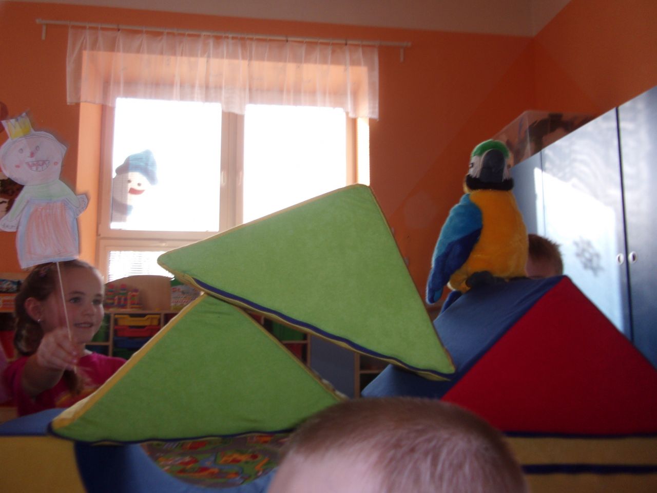 Jak už to tak bývá, ne vždy se dětem zavděčíte připravenými aktivitami. To se dnes potvrdilo ve třídě Mravenečků, kde si děti během volných her samy vytvořily loutky z papíru a pro svoje kamarády si připravily divadélko s názvem "Jak princ zachránil papouška" - představení bylo pojato moderní formou, kdy princezna jen prala prádlo v pračce a pokaždé se jí podařilo vyprat nějakého zvířecího kamaráda. Ty pak odnesl dinosourus a zde musel nastoupit nebojácný princ a vše zachránit. Později se k nám připojili i naši malí kamarádi z Berušek a mohli si spolu se staršími dětmi také vyzkoušet, jaké to je být loutkoherec.