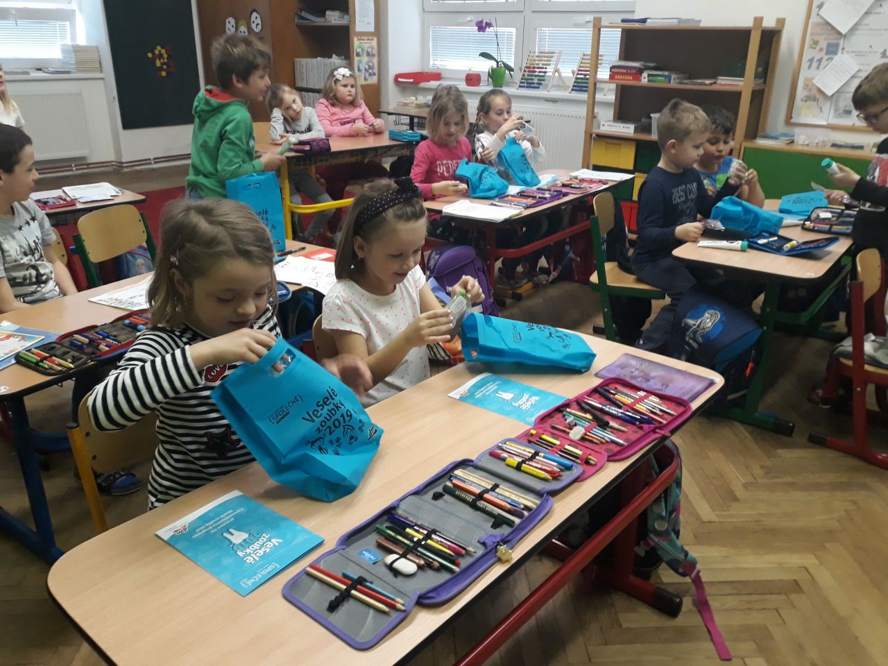 19. 3. se žáci prvního ročníku ve dvou hodinách prvouky seznámili velice zábavnou formou s projektem „Zdravé zoubky“. První část byla zaměřena na to, jak zoubky fungují, k čemu je máme, jak rostou a mění se a co je zubní kaz. Ve druhé části bylo zhlédnutí vtipného příběhu „ Jak se dostat Hurvínkovi na zoubek“, v třetí části jsme si povyprávěli o tom, jak správně pečovat o zoubky, jak si zoubky čistit, aby byly bez kazu, proč navštěvovat zubního lékaře. Poslední část projektu zapojila žáky do úkolů, které plnili na interaktivní tabuli. Žáci už ví, kolik mají zoubků a jak o ně pečovat, ví, jak vzniká kaz, a jak mu předejít. Nebojí se zubaře a umí si své zoubky správně vyčistit. Drogerie DM vybavila všechny žáky taštičkou, ve které mají vše, co potřebují k čištění svých zoubků. Všichni měli velkou radost a slíbili, že se o své zoubky budou řádně starat.