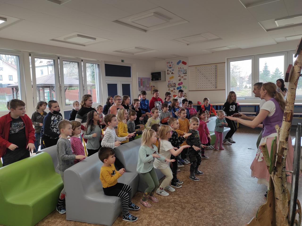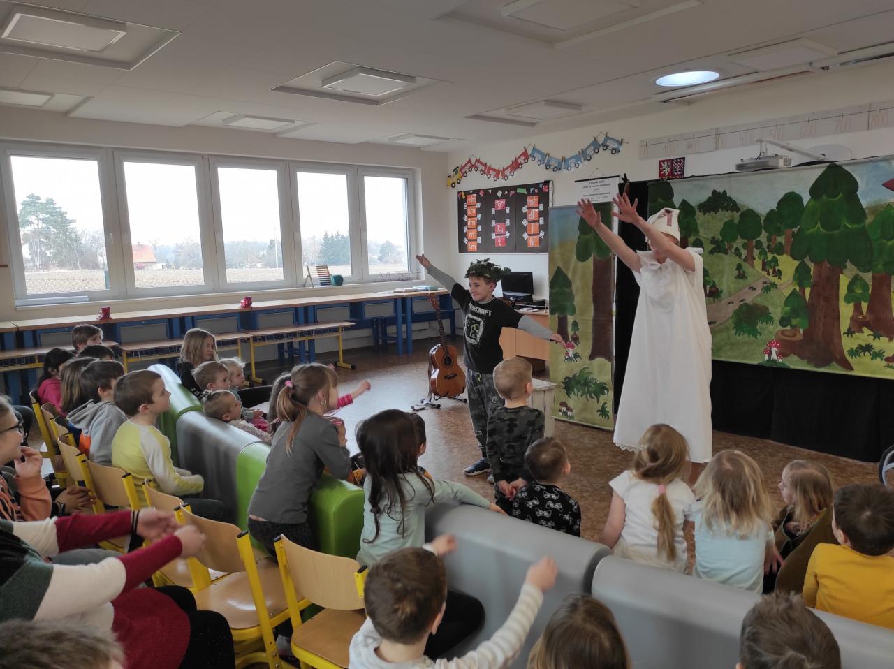 Ve čtvrtek 3. března za námi přijelo Divadélko Kůzle s pohádkou „Na kole i přes pole“. Představení, které bylo pro školní i školkové děti, proběhlo ve venkovní učebně, která se proměnila ve skutečné divadlo. Z některých našich dětí se dokonce stali herci, kteří se svých rolí úspěšně zhostili. Celé představení jsme si užili, a hlavně jsme se moc nasmáli.